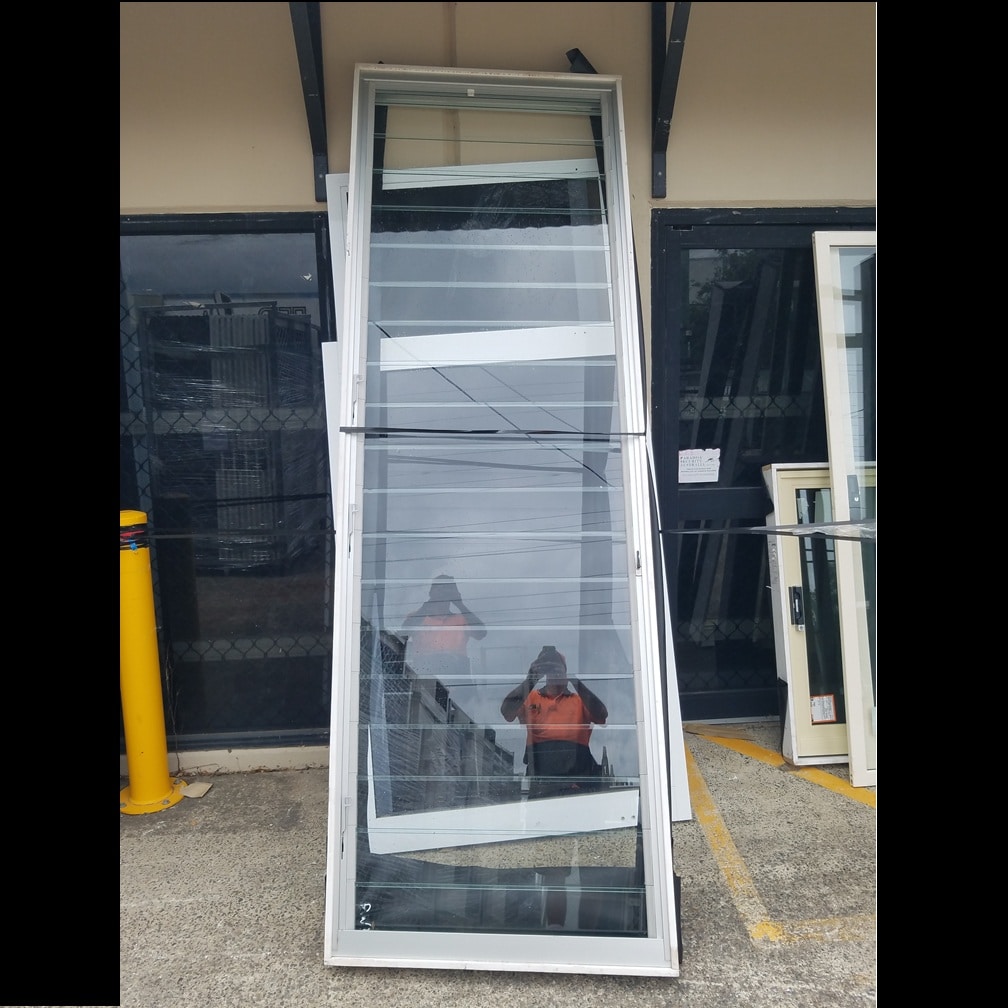 For sale is one 2800mm high by 900mm wide Clear Anodised (powdercoated) aluminium louvre window with 152mm clear glass louvre blades, 98mm timber reveal and a key. This is a factory second product and has been priced accordingly. Factory seconds are usually just cancelled orders but may have some minor marks from handling; as such, we recommend inspection prior to purchase.