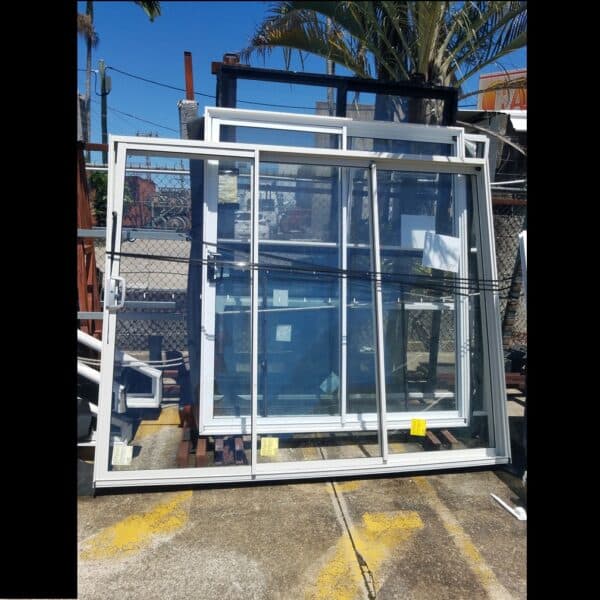For sale is one 2015mm high by 2460mm wide Surfmist (powdercoated) aluminium sliding door with clear glass and a key. The frame has been definned and measures 195mm deep. The configuration of this product from the outside, looking in is FSS (where F stands for fixed panel and S stands for sliding panel). This means that when you are on the outside, looking in the left hand panel of this product is fixed. The other two panels slide from the right to the left and stack back over the fixed panel. This is a factory second product and has been priced accordingly. Factory seconds are usually just cancelled orders but may have some minor marks from handling; as such, we recommend inspection prior to purchase.