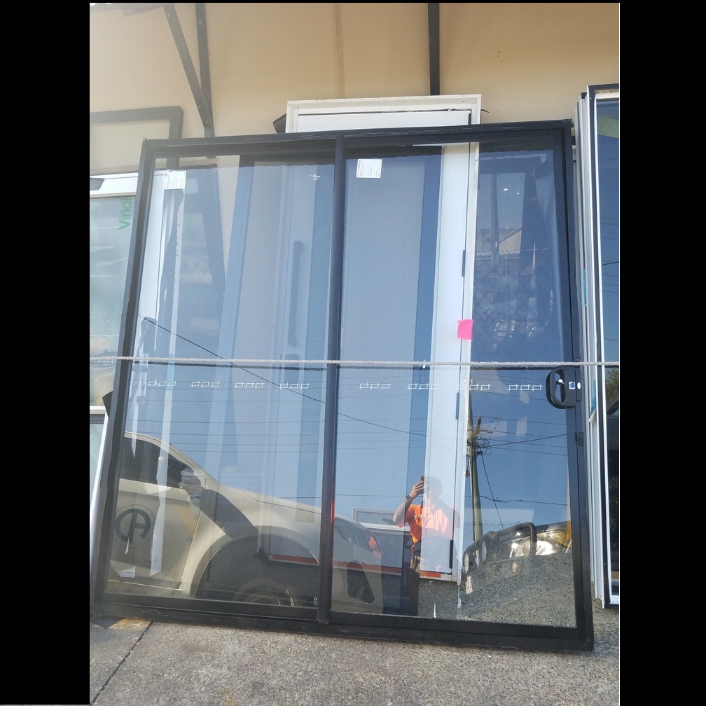 For sale is one 2350mm high by 2170mm wide Black (powdercoated) aluminium sliding door with 5mm clear glass and a key. The frame has been definned and measures 90mm deep. The configuration of this product from the outside, looking in is SF (where S stands for sliding panel and F stands for fixed panel). This means that when you are on the outside of the building looking in, the right hand panel of glass is fixed and the left panel slides (from the left to the right). This is a factory second product and has been priced accordingly. Factory seconds are usually just cancelled orders but may have some minor marks from handling; as such, we recommend inspection prior to purchase.