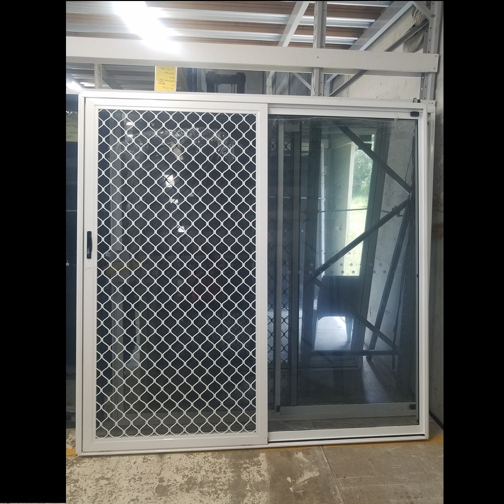 For sale is one 2100mm high by 2110mm wide Textura White (powdercoated) aluminium sliding door with 4mm toughened grey tinted (light tint) glass and a key. This door has a diamond safety screen to suit with matching key. The configuration of this product from the outside, looking in is SF (where S stands for sliding panel and F stands for fixed panel). This means that when you are on the outside of the building looking in, the right hand panel of glass is fixed and the left panel slides (from the left to the right). This door has N3 rated. As this is a brand new product, it will come with a form 15 (glazing certificate).