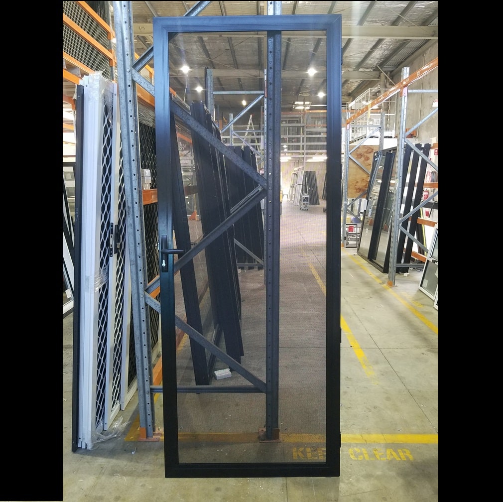 For sale is one hinged stainless steel view screen door measuring 2350mm high by 925mm wide. The frame is Black (powdercoated) aluminium. When viewed from the outside, looking in this door would be hinged on the right and swing open to the exterior. The handle height is approximately 1200mm. Unfortunately there is no key to suit the handle. This is a factory second product and has been priced accordingly. Factory seconds are usually just cancelled orders but may have some minor marks from handling; as such, we recommend inspection prior to purchase.